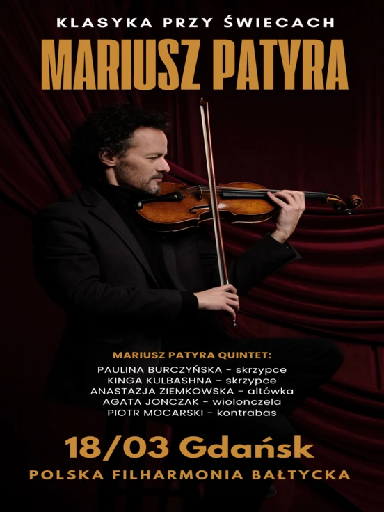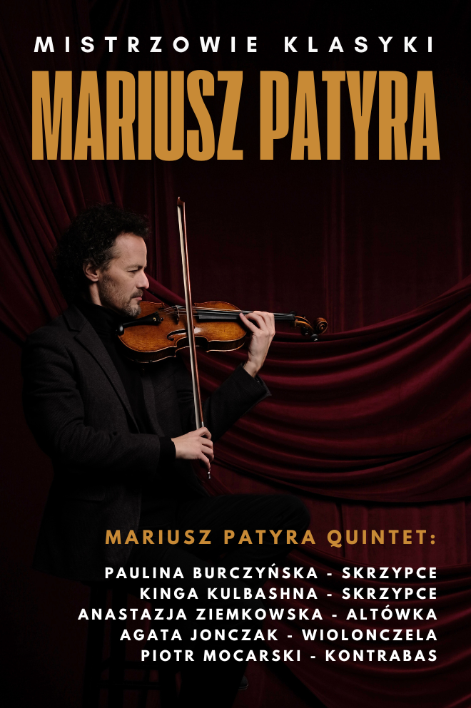 Zapraszamy na wieczór z muzyką klasyczną, w mistrzowskim wykonaniem. Gwiazdą wieczoru będzie jeden z najwybitniejszych polskich wirtuozów skrzypiec – Mariusz Patyra, o którym Zbigniew Wodecki mówił: „… o Mariuszu Patyrze, który jest uosobieniem tego, o czym marzyli moi rodzice, żebym ja, Zbysiu, był najlepszym skrzypkiem na świecie. To jest jedyny Polak, który wygrał konkurs Paganiniego. Jest takim skrzypcowym Zimermanem…”, a po koncercie „Czterdziestka Zbigniewa Wodeckiego”, na którym gościnnie wystąpił Mariusz Patyra, Jubilat powiedział: „To był dla mnie zaszczyt”.