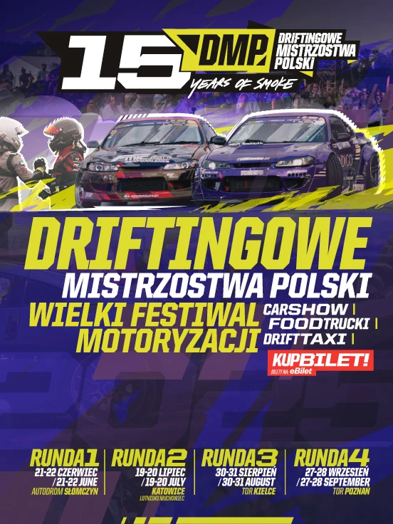 Driftingowe Mistrzostwa Polski 2025 // 15 Years Of Smoke – adrenalina, ryk silników i dym spod opon! Najmocniejsza krajowa liga driftingowa w Europie powraca! Cztery lokalizacje, tysiące kibiców i najlepsi kierowcy, którzy walczą o tytuł Mistrza Polski oraz awans do prestiżowych zawodów Drift Masters 2026. To wydarzenie, którego nie możesz przegapić!