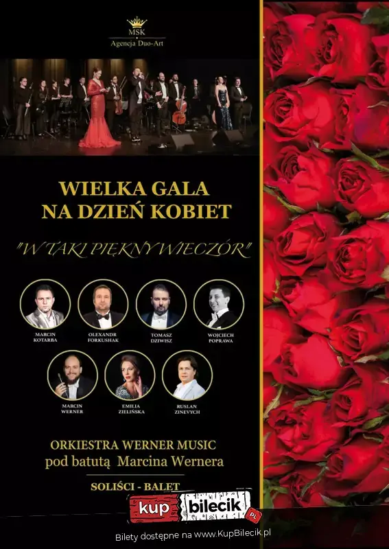 Dlatego też, pragnąc podziękować Im za ich obecność zapraszamy Państwa na wyjątkowy koncert z okazji Dnia Kobiet! Na scenie zaprezentują się znakomici soliści z towarzyszem orkiestry, którzy wykonywać będą repertuar doskonale oddający nastrój i charakter koncertu. "Brunetki blondynki" , "Artystki z Variete", " My way", "Granada" , " Bo z dziewczynami" , " W taki piękny wieczór", " Baby, ach te baby", " O sole mio" , " Bella ciao" to tylko niektóre przeboje, jakie rozbrzmiewać będą tego wieczoru!! Dodatkowo specjalnie dla Państwa przygotowaliśmy muzyczną niespodziankę, która z pewnością uczyni nasz koncert jeszcze bardziej wyjątkowym!