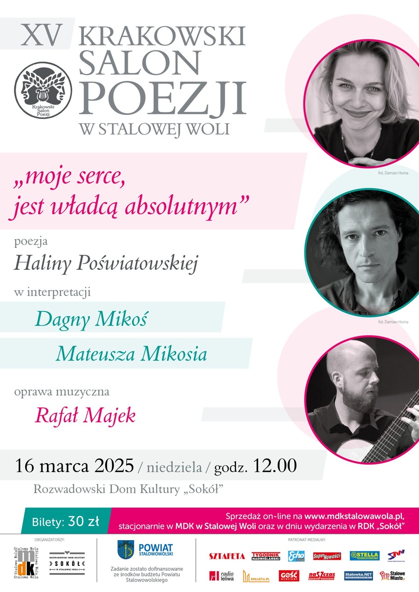 Serca drżenie, miłosne uniesienia, tchnienie przemijania odmalowane w świecie poetyckiej wyobraźni Haliny Poświatowskiej podczas XV Krakowskiego Salonu Poezji w Stalowej Woli odczyta dla nas duet w codzienności i na scenie, rzeszowscy aktorzy: Dagna i Mateusz Mikosiowie, a o warstwę muzyczną zadba gitarzysta Rafał Majek.