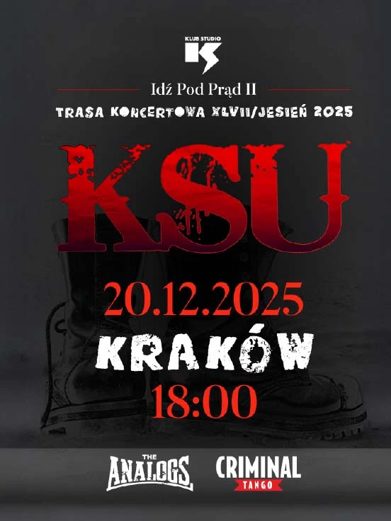 Już tej jesieni zapraszamy Was na trasę koncertową „Idź pod prąd II”, podczas której KSU odwiedzi największe miasta i kluby w Polsce, a także Dodrecht (Holandia) i Londyn (Wielka Brytania). Na koncertach usłyszycie zarówno najbardziej znane utwory KSU jak i te nowsze, w odświeżonej setliście. W Krakowie KSU zagra z przyjaciółmi z zespołów: The Analogs, Cryminal Tango.
