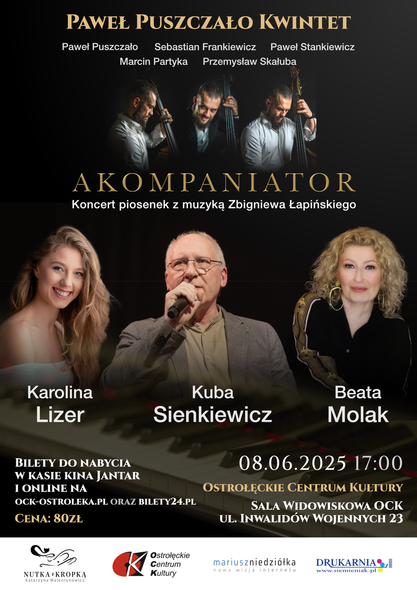 Zapraszamy w sobotę 8 czerwca o godzinie 17.00 na salę widowiskową Ostrołęckiego Centrum Kultury na wyjątkowe wydarzenie zatytułowane "Akompaniator" - koncert piosenek z muzyką Zbigniewa Łapińskiego, do tekstów polskich poetów współczesnych: Karola Wojtyły, Wojciecha Młynarskiego, Tadeusza Nowaka czy Danuty Sokołowskiej.