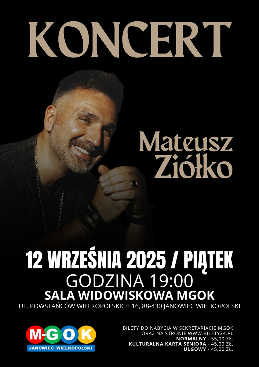 Miejsko-Gminny Ośrodek Kultury w Janowcu Wielkopolskim zaprasza na wyjątkowy koncert Mateusza Ziółko – jednego z najciekawszych i najbardziej utalentowanych wokalistów młodego pokolenia.