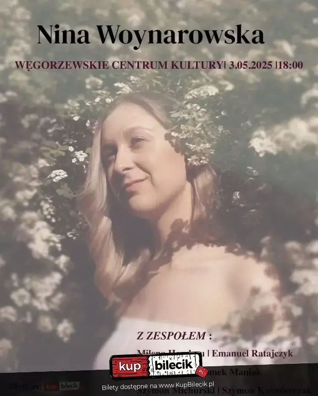 Zapraszamy na majowy koncert Niny Woynarowskiej, rodowitej mieszkanki Węgorzewa, która po ukończeniu wokalistyki jazzowej na Akademii Muzycznej w Łodzi, powraca do swojego rodzinnego miasta, by podzielić się z mieszkańcami swoją pasją do muzyki. Wraz z zespołem, w składzie: Milena Handszu (saksofon altowy), Szymon Michurski (gitara), Emanuel Ratajczyk (instrumenty klawiszowe), Dominik Róg (gitara basowa), Tomek Maniak (perkusja) i Szymon Kuśmierczak (backup singer), Nina zabierze nas w podróż przez dźwięki, które odsłonią przed nami nowe wymiary jej muzycznego świata.