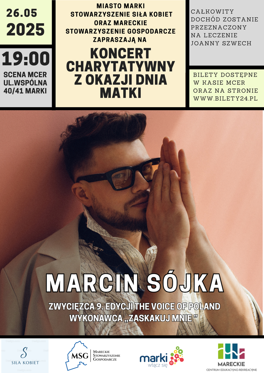 Miasto Marki, Stowarzyszenie Siła Kobiet oraz Mareckie Stowarzyszenie Gospodarcze zapraszają na wyjątkowy Koncert Charytatywny z okazji Dnia Matki. Gwiazdą wieczoru będzie Marcin Sójka!