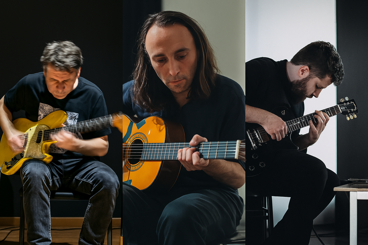 Trzy gitary, trzej soliści – spotkanie trzech indywidualnych języków, które łączy szacunek do fizyczności instrumentu i potrzeba jego redefinicji. Kostkiewicz i Doskocz używają dźwięku jako bodźca do kolejnych zdarzeń, Strzał w kolano – jako niestałego budulca. Wspólna formuła solowych setów może przerodzić się w „trialog”, a więc muzyczny dialog wyższego rzędu.
