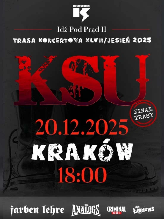 Już tej jesieni zapraszamy Was na trasę koncertową „Idź pod prąd II”, podczas której KSU odwiedzi największe miasta i kluby w Polsce, a także Dodrecht (Holandia) i Londyn (Wielka Brytania). Na koncertach usłyszycie zarówno najbardziej znane utwory KSU jak i te nowsze, w odświeżonej setliście. W Krakowie KSU zagra z przyjaciółmi z zespołów: The Analogs, Farben Lehre, Cryminal Tango oraz De Łindows!