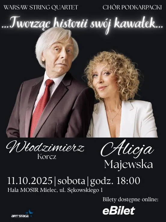 Zapraszamy na fantastyczny koncert Alicji Majewskiej i Włodzimierza Korcza w Hali Widowiskowo-Sportowej MOSiR w Mielcu - bilety już dostępne. Alicja Majewska i Włodzimierz Korcz zaprezentują swoje największe przeboje w wyjątkowych aranżacjach. Towarzyszyć im będzie Warsaw String Quartet oraz Chór Podkarpacki.