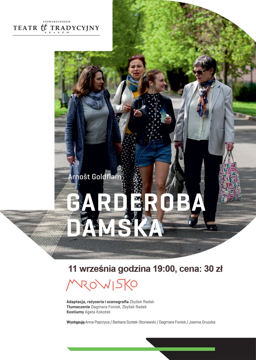 Czy wiecie, które miejsce w teatrze jest naprawdę najważniejsze? Tam zapadają decyzje, tam się dyskutuje, ocenia wszystko i wszystkich. Tym tajemniczym miejscem jest właśnie... garderoba damska. Poprzez spotkania i rozmowy w garderobie teatralnej ta komedia pozwala spojrzeć na losy czterech aktorek. Do życia Marii wkracza nowy mężczyzna. Maria przeżywa pierwsze uniesienia i rozczarowania. Trudę jej mała córeczka ponownie opuszcza mąż. Młodziutka Klara marzy o roli i sukcesie. Najstarsza w zespole Liza szuka sensu istnienia w starości. Losy czterech aktorek przeplatają się zarówno w życiu zawodowym, jak i osobistym. Komedia Garderoba damska doskonale ukazuje często ukrywane atrakcje życia teatralnego za kulisami. Nie brakuje humoru sytuacyjnego. A widzowie mają wyjątkową okazję do wspaniałej zabawy.... lubię pisać dla kobiet, dla aktorek. Po pierwsze dlatego, żeby lepiej je zrozumieć, ale również dlatego, że lubię ich sposób myślenia, reakcje, ich życie. Garderobę damską napisałem jako podziękowanie za ich starania, opie, zmęczenia, za wszystko. Chciałem opowiedzieć o ich losach, które poznałem przez lata pracy w teatrze. Garderoba damska to spojrzenie zza kulisów w codzienność na pozór teatralną. Mam nadzieję, że przybliżyłem wam aktorki i ich życie, którego może nie znaliście. I mam też maleńką nadzieję, że będziecie się dobrze bawić. Arnost Goldflam