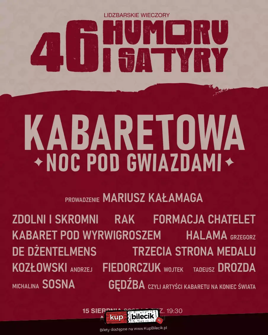 KABARETOWA NOC POD GWIAZDAMI "MĘSKIE ŻARTOWANIE". W tym roku chcemy pożartować z mężczyzn, innymi słowy sobie "pojanuszować" i "pochłopcować". Jak widzi świat mężczyzna młody i zadziorny, a jak doświadczony i "znający życie".