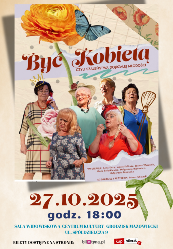 Spektakl „Być kobietą, czyli szaleństwa dojrzałej młodości” to doskonała komedia dla chcących pośmiać się do ostatniej minuty. Sześć kobiet w dojrzałym wieku przybywa do koleżanki, aby uczcić 60-tkę przyjaciółki. Gospodyni jest przygotowana na tę uroczystość, więc zastawia suto stół i czeka na swoje koleżanki. Przezabawne i urocze, singielki, wdowy oraz matki i mężatki przedstawiają siebie na scenie w obliczu nieuchronnej dojrzałości, wspominając chwile swojej młodości. Spektakl łączy elementy kabaretu, musicalu i farsy. Niezabranie wspaniałych polskich utworów z lat 70 oraz codziennych scenek z życia każdego z nas.