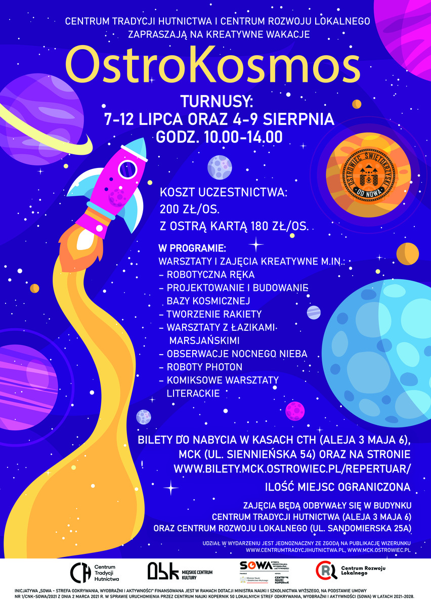 Centrum Tradycji Hutnictwa i Centrum Rozwoju Lokalnego zapraszają dzieci na kreatywne wakacje „OstroKosmos”! To niezwykła kosmiczna przygoda pełna nauki, zabawy i twórczych wyzwań. Zajęcia odbędą się w dwóch turnusach: 7–12 lipca oraz 4–9 sierpnia w godz. 10:00–14:00.