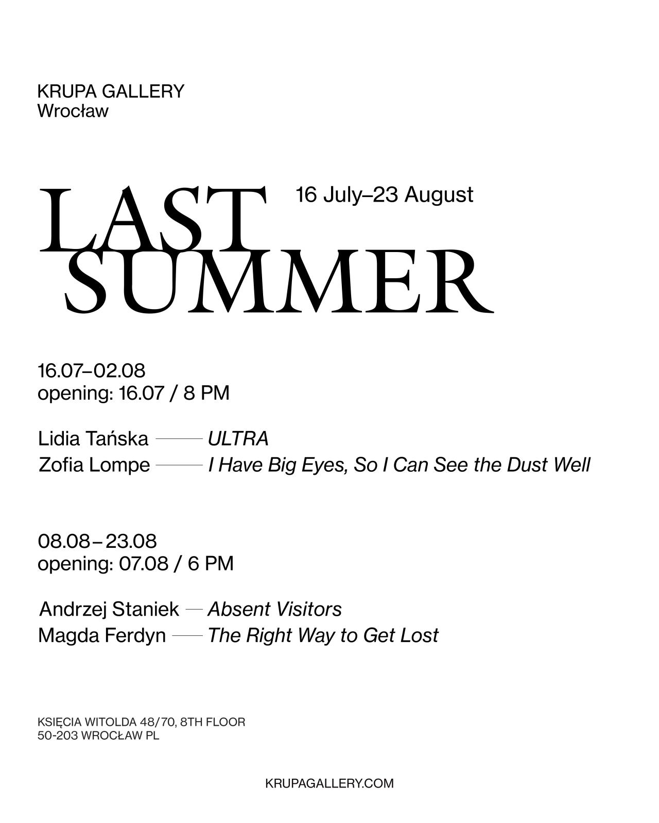 Cykl wystaw LAST SUMMER odpowiada na ten szczególny moment – czas zawieszenia pomiędzy zakończeniem studiów a tym, co nadejdzie później. Choć różnorodne pod względem formy i tematyki, prezentowane prace poruszają wspólne wątki: pamięć, tożsamość, żałobę ekologiczną, wykluczenie społeczne oraz niepokój związany z przemianami osobistymi i planetarnymi. LAST SUMMER nawiązuje do tzw. „najdłuższego lata” – przejściowego okresu pomiędzy życiem studenckim a dorosłością. Dla tych artystów staje się on metaforą szerszych pytań: Co dalej? Jak poruszać się naprzód w świecie stojącym w obliczu kryzysu, upadku i redefinicji? Ich prace odnoszą się do ziemi i ciała, historii i powtórzenia, niewidzialnej pracy oraz głęboko osobistych stanów straty, zagubienia i nadziei.