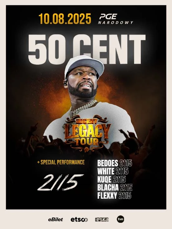 Rapowa historia pisze się na naszych oczach. 10 sierpnia 2025 PGE Narodowy w Warszawie stanie się areną jednego z największych hip-hopowych wydarzeń w historii Polski! 50 Cent – ikona rapu, zdobywca Grammy, autor multiplatynowych hitów i twarz złotej ery hip-hopu – po raz pierwszy wystąpi na PGE Narodowym, największym stadionie w Polsce! U jego boku zobaczymy kolektyw 2115. Bilety na koncert 50 Centa już dostępne.