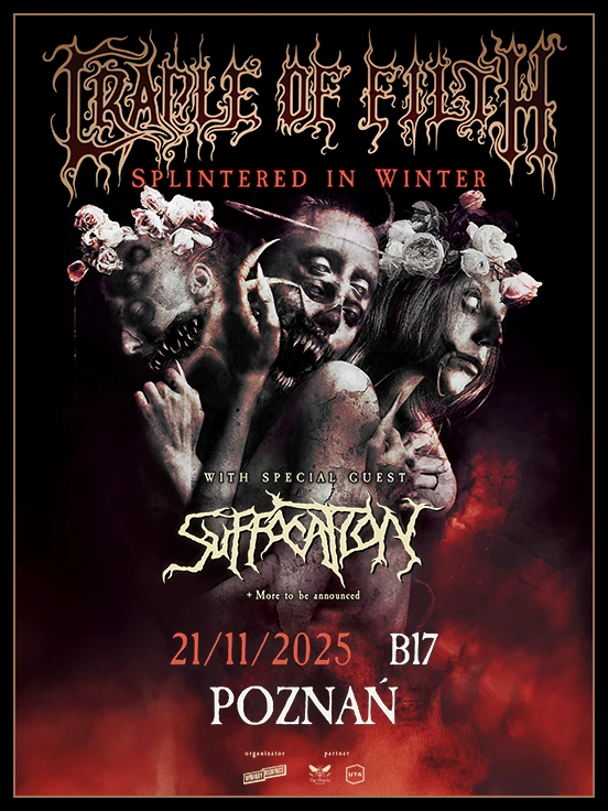 Na najbliższe wojaże po Europie Cradle of Filth zabierają bogów śmiercionośnej precyzji - Amerykanów z Suffocation. Ich debiut “Effigy of the Forgotten” (1991) był kamieniem milowym dla całego gatunku - połączył bezwzględną brutalność z niedoścignionym poziomem techniki, dając początek stylowi znanemu dziś jako brutal death metal. Utwory takie jak „Liege of Inveracity” czy „Infecting the Crypts” do dziś pozostają wzorcami dla setek młodszych kapel, a wpływ Suffocation słychać od brutal deathu, przez slam, aż po współczesny deathcore. Ich ostatni jak dotąd album, “Hymns from the Apocrypha” (2023), udowadnia, że zespół wciąż potrafi tworzyć materiał intensywny, gęsty i przepełniony niepokojem, bez popadania w rutynę czy schemat.