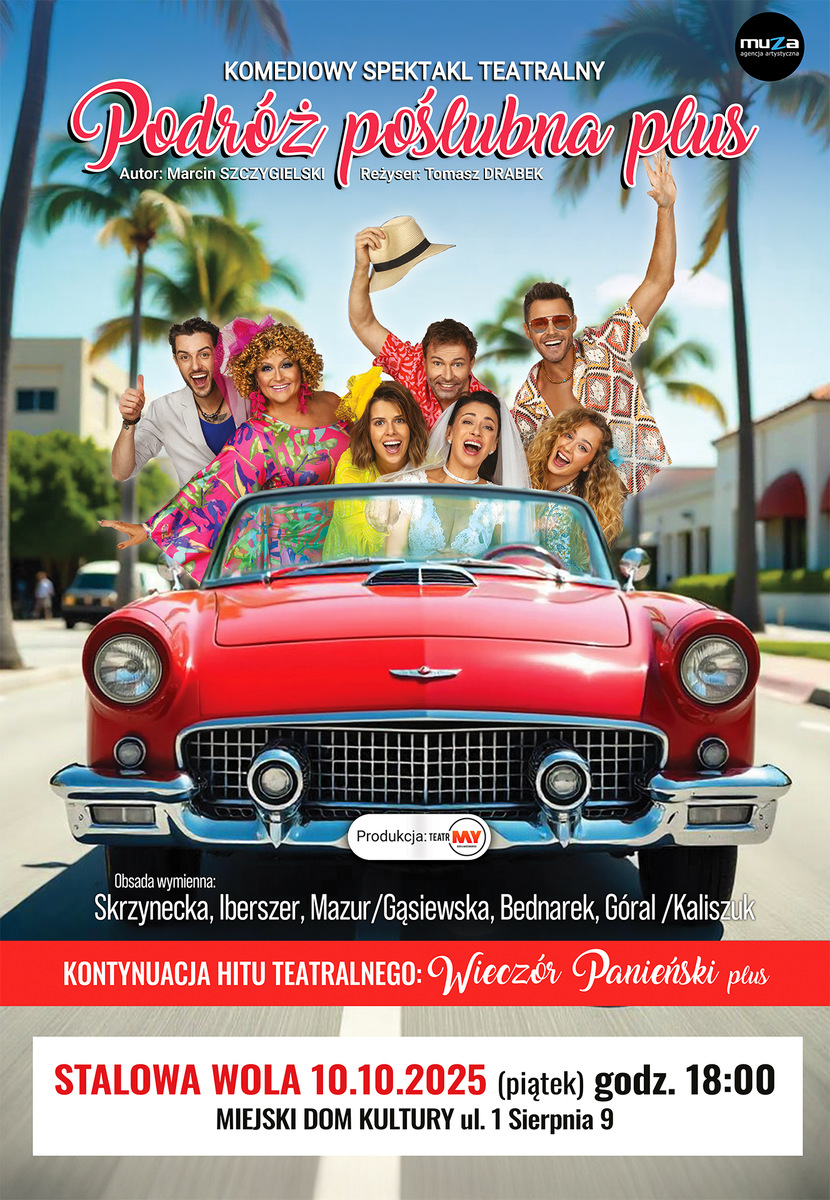 Po sukcesie spektaklu pt. „Wieczór panieński plus", autor Marcin Szczygielski napisał najnowszą komedię pt. „Podróż poślubna plus", będącą kontynuacją losów bohaterów „Wieczoru...". Przed bohaterami nowe, niekoniecznie usłane różami życie. Jednak nim ono się rozpocznie, pora na miłość i upojny miesiąc miodowy. W podróż poślubną na egzotyczną wyspę wyruszają dwie młode pary plus jedna niedoszła panna młoda, której przyjaciele nie mają serca zostawić samej w domu. Jednak nic nie idzie zgodnie z planem. Zamiast do raju, bohaterowie trafiają prosto w oko cyklonu, w którym muszą zmierzyć z huraganem, gangsterami i niemniej groźną szefową hotelu... A to zaledwie początek ich problemów! „Podróż poślubna plus" na pewno przypadnie Wam do gustu, podobnie jak „Wieczór panieński plus"!