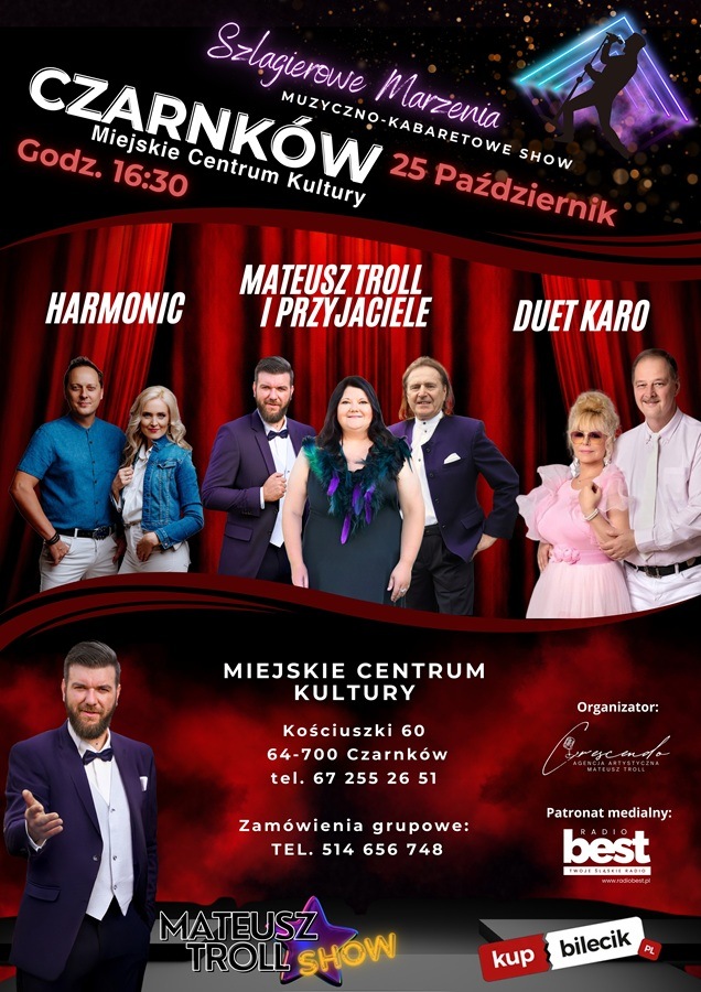 Już 25 października o godzinie 16:30 spotkajmy się, by wspólnie przeżyć ponad 120 minut wspaniałej zabawy i dobrego humoru. Na scenie wystąpią artyści, których twórczość cieszy się uznaniem w całym kraju. Ich bogaty i różnorodny repertuar trafia do serc odbiorców w każdym wieku. To stali goście takich stacji telewizyjnych jak TVS Silesia, Polo TV, TV Trwam, TVP Katowice, TVT gdzie ich występy od lat przyciągają widzów.
