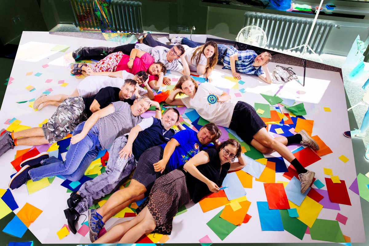 Grupa trzynastu osób leży wspólnie na białej podłodze pokrytej kolorowymi kartkami papieru. Osoby ułożone są blisko siebie, większość z nich uśmiecha się lub patrzy w stronę aparatu. W tle widać grzejniki, lampę studyjną i inne elementy wyposażenia wnętrza. Zdjęcie ma radosny, kreatywny charakter.