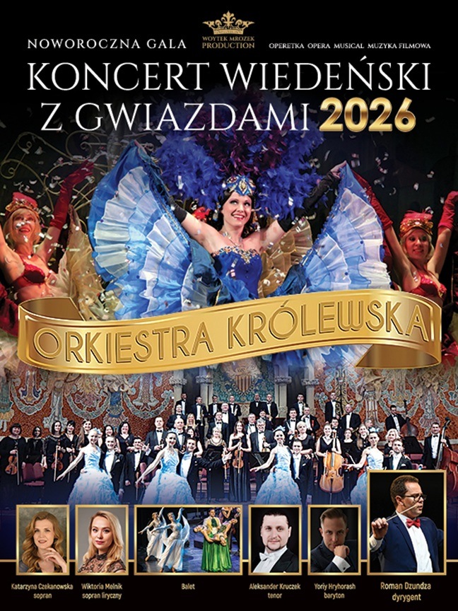 Zapraszamy Państwa w podróż do roztańczonego i magicznego Wiednia, gdzie będą rozbrzmiewać najpiękniejsze arie, duety, walce i polki Johanna Straussa, Franca Lehara, Imre Kalmana. Tegoroczny koncert w wykonaniu światowej Królewskiej Orkiestry pod dyrekcją znakomitego dyrygenta Romana Dzundzy – wieloletniego dyrygenta symfoniczno – operowego i dyrektora artystycznego Filharmonii w Ivano-Frankivsku. Artysta pełni funkcję zastępcy dyrektora artystycznego międzynarodowego projektu Ukrainian Art Song Project, jest ekspertem Ukraińskiego Funduszu Kultury oraz laureatem nagrody im. M. Pidhirianki, co świadczy o wysokiej ocenie jego wkładu w sferę życia kultury. Orkiestrze towarzyszyć będą europejskiej klasy soliści międzynarodowych scen. Wśród solistów usłyszą Państwo wyjątkową - unikalną sopranistkę Wiktorię Melnik, Studiowała śpiew operowy w Narodowej Akademii Muzycznej w Kijowie. Zadebiutowała partią Mikaeli w operze „Carmen” na scenie Lwowskiej Opery Narodowej. Wykonała tytułową rolę w operze „La Traviata” w Operze w Burgas w Bułgarii. Artystka jest laureatem i zdobywcą specjalnych nagród wykonawczych w konkursach wokalnych na Ukrainie, w Polsce, Włoszech, Niemczech, Chorwacji i Bułgarii. Katarzyna Czekanowska – sopran. Artystka jest laureatką międzynarodowych i krajowych konkursów wokalnych, m.in. Grand Prix im. S Kruszelnickiej oraz zdobywczynią pierwszej nagrody w międzynarodowym konkursie wokalnym w Cambridge 2023/Anglia. Solistka koncertuje w Polsce, Francji, Niemczech, Austrii, Belgii. Aleksander Kruczek tenor to ulubieniec publiczności i jeden z najlepszych polskich tenorów młodego pokolenia. Tenor obdarzony wyjątkową barwą głosu. Jest laureatem wielu międzynarodowych konkursów wokalnych. Solista Aleksander Kruczek to polski tenor. Ukończył Akademię Muzyczną w Katowicach i Studium Wokalno-Baletowe przy Teatrze Muzycznym w Gliwicach. Brał udział w programie kształcenia młodych talentów w Operze Narodowej. W Teatrze Muzycznym w Gliwicach występował w operetkach, takich jak "Orfeusz w piekle", "Carmen", "Noc w Wenecji", "Hrabina Marica" i "Wesoła wdówka". Współpracował z teatrami operowymi w Łodzi, Warszawie i Poznaniu. Brał udział w festiwalach muzycznych, m.in. w Festiwalu „Gloria”, Śląskim Festiwalu im. Beethovena, Festiwalu „Ave Maria”, Festiwalu Muzyki Wiedeńskiej i Letnim Festiwalu Muzycznym w Krynicy-Zdroju. Jest laureatem konkursów wokalnych. Koncertował w Belgii, Niemczech, Hollandii, Polsce, Luksemburgu, Włoszech i Francji. Yuri Hryhorasz - baryton, śpiewak operowy i musicalowy, absolwent Narodowej Akademii Muzycznej we Lwowie. Członek grupy a cappella "LaVIVo". Artysta jest gościnnym solistą Lwowskiej Opery Narodowej i Lwowskiej Filharmonii Narodowej oraz solistą Opery Wrocławskiej. Brał udział w wielu międzynarodowych projektach w wielu krajach na całym świecie: Niemcy, Szwajcaria, Hiszpania, Kanada, Stany Zjednoczony, Chiny, Hongkong. Wokalista współpracował na jednej scenie z takimi gwiazdami jak: Dennis Adu, Dirty Loops, Frank London, Anthony Strong i wieloma innymi. Artyści przeniosą słuchaczy do ojczyzny walca prezentując niezwykły kunszt wokalny i instrumentalny. Ta niezwykła gala będzie wzbogacona wirtuozerskim tańcem par tanecznych, barwnymi kreacjami i bogatą choreografią, co pozwoli na doświadczenie wielu doznań artystycznych w iście książęcym stylu. Pary taneczne to soliści Narodowego Teatru Opery i Baletu we Lwowie. W ten magiczny wieczór zabrzmią największe przeboje Króla walca Johanna Straussa takie jak uwertura z Zemsty Nietoperza, Keiser Marsz, Marsz Radezki, walc „Nad pięknym modrym Dunajem”, „Wiedeńska krew”, czy „Odgłosy wiosny” a także polki Trich Trasch, Eljen Magiar Polka, Anne Polka, Gromy i Błyskawice i wiele innych orkiestrowych szlagierów. Nie zabraknie także popisowych arii i duetów z najsłynniejszych operetek: Zemsty Nietoperza, Barona Cygańskiego, Księżniczki Czardasza, Hrabiny Maricy, Wesołej Wdówki czy Krainy Uśmiechu. Publiczność wysłucha między innymi: arie „Adeli”, „Czardasz Sylvi”, kuplety Barinkaya „Wielka sława to żart”, „Graj Cyganie”, „ Artystki z Variete”, „Brunetki Blondynki” a także duety wszechczasów, m.in. „Usta milczą dusza śpiewa”, „Jakże mam Ci wytłumaczyć”, „ Jedź do Verasdin”, „ Co się dzieje oszaleję”, „W rytm walczyka”. Nie zabraknie także sztandarowych pieśni neapolitańskich takich jak: „O sole mio”, „Funikuli-Funikula”, „O Surdato N’namurato” oraz wiele innych muzycznych niespodzianek. Koncert Wiedeński to potęga wokalu, która wzbudza entuzjazm nie tylko dzięki odmiennym możliwościom głosowym, ale także poprzez porywającą energię na scenie, która udziela się publiczności. Każdy koncert jest świętem muzyki wokalnej, a publiczność wprost uwielbia ich miły i autentyczny sceniczny wizerunek. Zapraszamy wszystkich melomanów i miłośników światowej wokalistyki w klimatyczną podróż w dobrym muzycznym stylu do przebogatego świata operetki. Koncert poprowadzi znakomity polski konferansjer Piotr Skubis, który jest zakochany w przebogatym świecie operetki.