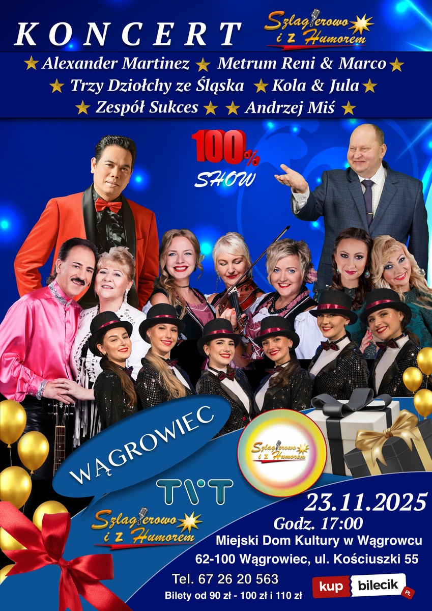 Z ogromną dawką Szlagierowej Muzyki na deskach Miejskiego Domu Kultury w Wągrowcu, pojawią się Wykonawcy znani z wielu Stacji Telewizyjnych, oraz Rozgłośni Radiowych na Śląsku i nie tylko. Wystąpią dla Państwa: Metrum Reni & Marco, Kola i Jula, Trzy Dziołchy ze Śląska oraz Alexander Martinez. Ponad trzy godziny Niesamowitego Show Szlagierowo i z Humorem poprowadzi – Andrzej Miś.