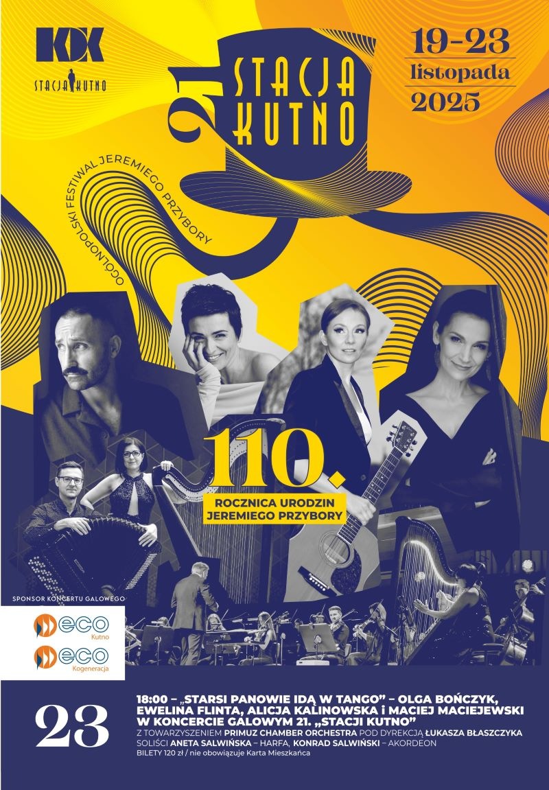"Starsi Panowie idą w tango" to niezwykły projekt muzyczny, który zabrzmi w tym roku na gali finałowej Festiwalu "Stacja Kutno". Na scenie usłyszymy prawie 30 artystów! Wśród nich - znakomici wokaliści: Ewelina Flinta, Olga Bończyk, Alicja Kalinowska, Maciej Maciejewski, a także instrumentaliści: Aneta Salwińska (harfa) i Konrad Salwiński (akordeon). Dopełnieniem tego niespotykanego zestawienia głosów i instrumentów jest wszechstronne i dynamiczne brzmienie PRIMUZ Chamber Orchestra pod dyrekcją Łukasza Błaszczyka. Program, specjalnie zaaranżowany na tę okazję, połączy w sobie elegancję słowa i melodii z rytmem tańca. Słynne piosenki Jeremiego Przybory i Jerzego Wasowskiego zyskają nową, taneczną odsłonę, tworząc barwne i pełne energii widowisko.