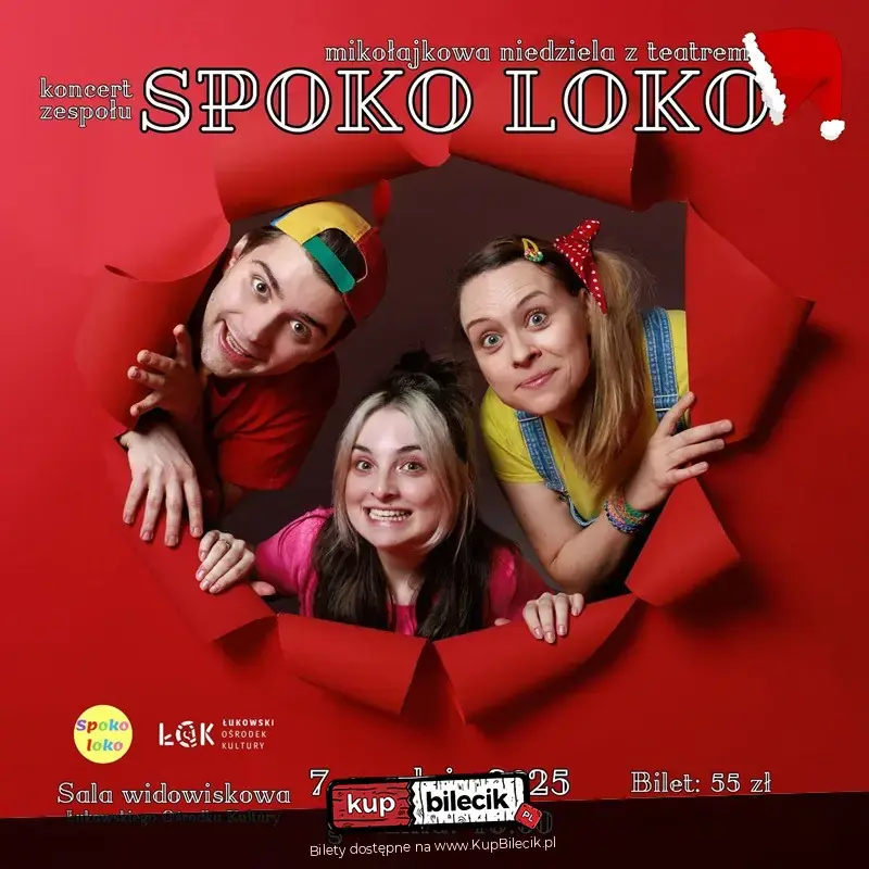 Jedyne takie show dla całych rodzin! Godzinne tańce dla dzieci, podczas których dzieciaki razem z zespołem zatańczą i zaśpiewają do takich piosenek jak: "Tańce Połamańce", "Ciu ciu ła", "A ram sam sam" i wieeeele innych. Podczas koncertu nie zabraknie także magicznych sztuczek oraz... więcej nie zdradzimy! Spoko Loko, czyli Kasia, Karolina i Mateusz. Na swoim koncie na YouTube mają kilkadziesiąt milionów wyświetleń. W 2020 roku na Dzień Dziecka wydali swoją pierwszą płytę "Tańce Połamańce". Opinie zadowolonych rodziców mówią same za siebie! Przyjdźcie do Łukowskiego Ośrodka Kultury i dajcie się porwać rodzinnie w zwariowany świat Spoko Loko!