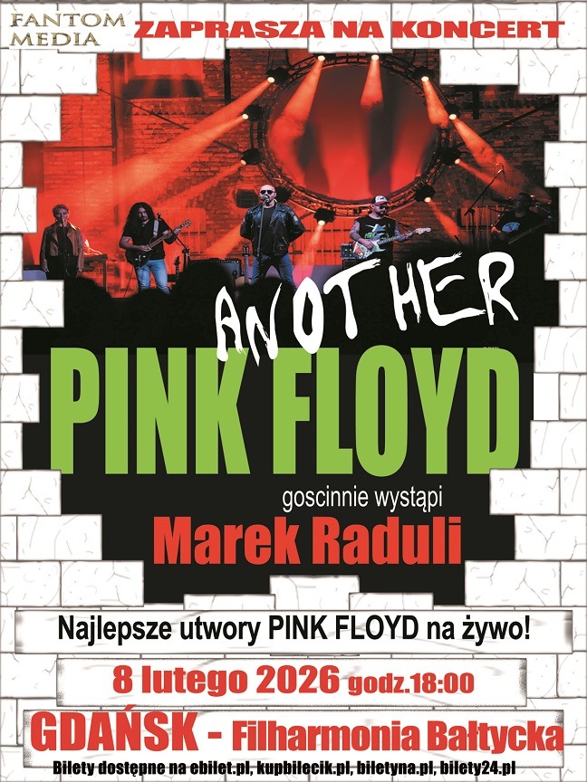 8 lutego na scenie Filharmonii Bałtyckiej przy ul.Ołowianka 1 w Gdańsku wystąpi zespół Another Pink Floyd, uznawany za jeden z najlepszych zespołów grających muzykę Floydów na żywo, a na koncert zaproszenie przyjął i wraz z muzykami Another gościnnie wystąpi Marek Raduli - bezdyskusyjnie najpiękniej brzmiący gitarzysta w Polsce, występujący w takich zespołach jak Budka Suflera, Bajm, Banda i Wanda