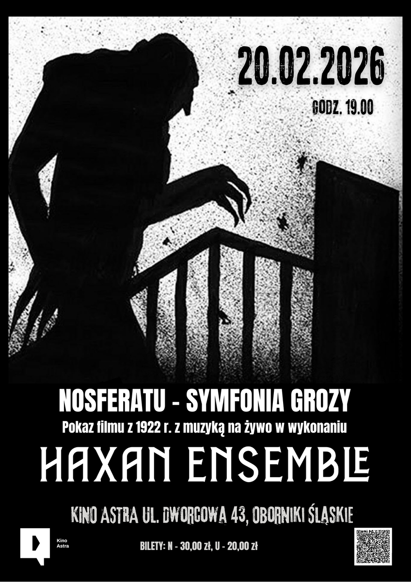 Zapraszamy na projekcję kultowego filmu niemego „Nosferatu – Symfonia Grozy” (1922, reż. Friedrich Murnau) z autorską muzyką wykonywaną na żywo przez Haxan Ensemble.
