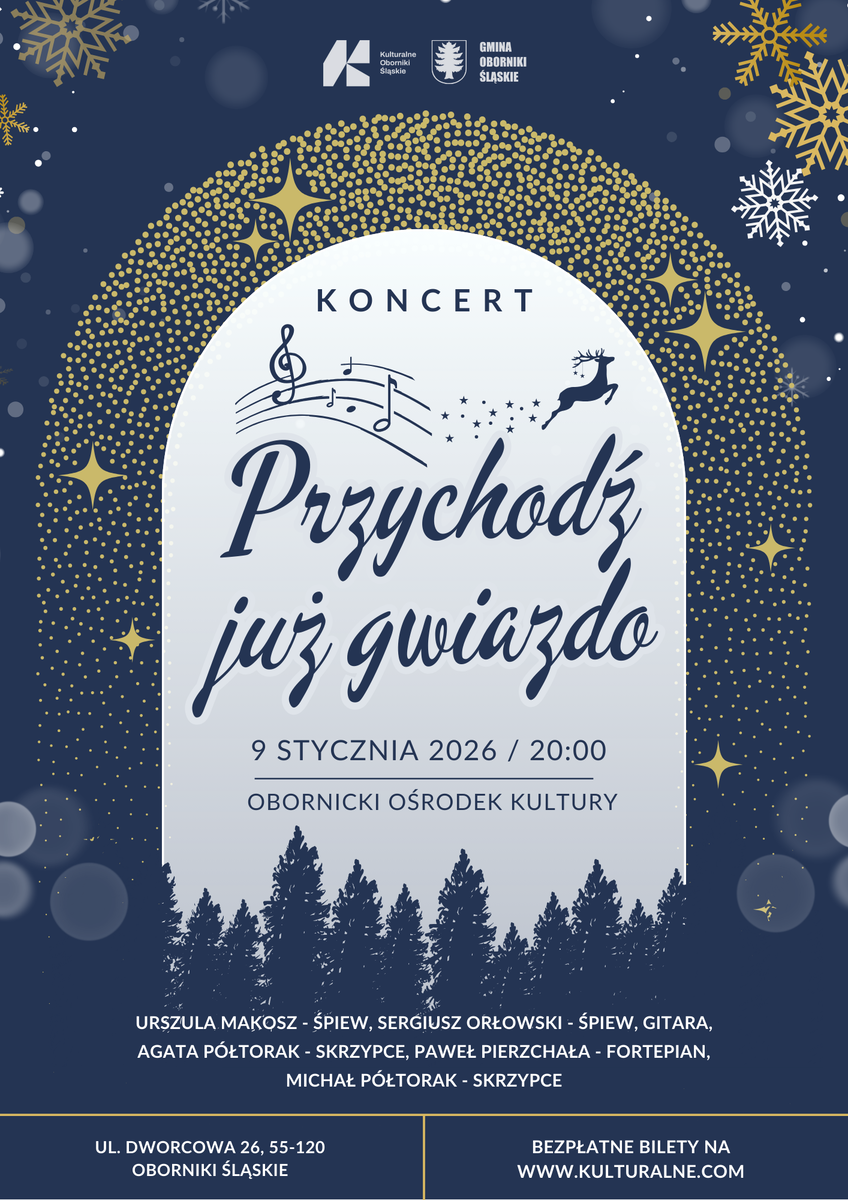 Zapraszamy na koncert świąteczny zatytułowany „Przychodź już gwiazdo”, podczas którego zabrzmią kolędy, pastorałki oraz piosenki zimowe i świąteczne. W programie znajdą się zarówno tradycyjne utwory, jak i współczesne kompozycje, tworzące ciepłą, zimową atmosferę.