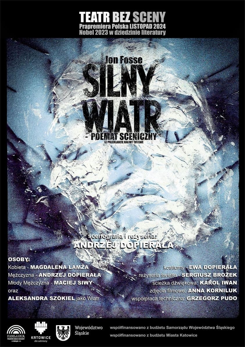 „Silny wiatr” poemat sceniczny Jona Fossego, ubiegłorocznego Laureata Nagrody Nobla. Według Andrzeja Dopierały. Polska prapremiera. Mężczyzna próbuje wrócić do domu, który opuścił. Dom i jego Kobieta wyglądają inaczej niż pamięta. Wieje silny wiatr, który otwiera okna, Oczy.