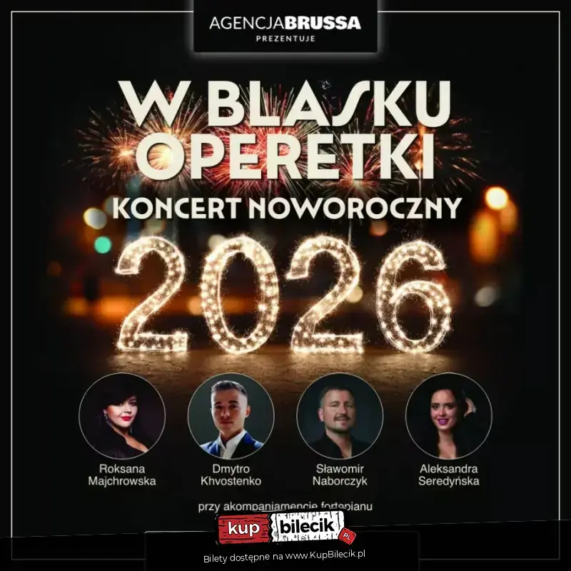Czterech znakomitych solistów i pianistka zabiorą Państwa w muzyczną podróż pełną wdzięku, humoru i emocji. W programie znajdą się największe operetkowe przeboje i światowe hity: "Wielka sława to żart", "Czardasz Silvy", "Usta milczą", a także "New York, New York", "My Way", "Malade" czy finałowe "Happy New Year" i "Feliz Navidad". To pełen klasy, lekkości i radości koncert, w którym magia sceny łączy się z noworoczną energią, a każda melodia staje się muzycznym życzeniem szczęścia na nadchodzący rok.