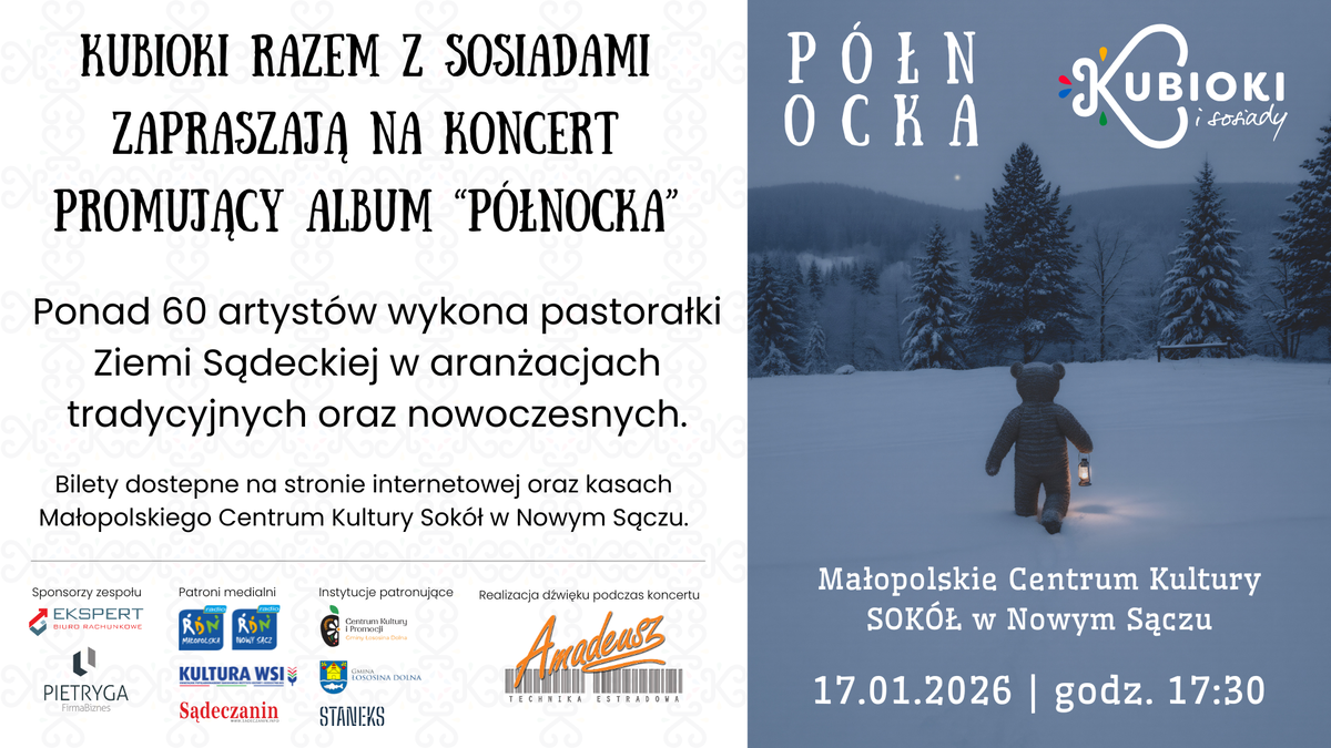 Album “Północka” to złożony projekt muzyczny poświęcony kulturze Lachów Sądeckich, w który zaangażowanych jest ponad 60 artystów. Koncert zaprezentuje pastorałki regionu Ziemi Sądeckiej w dwóch skrajnych, ale uzupełniających się wymiarach: