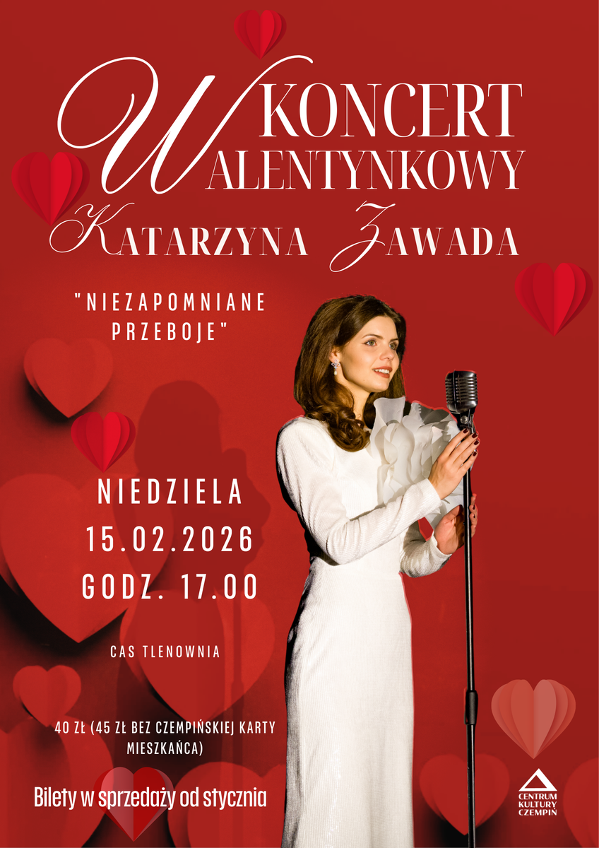W niedzielę 15 lutego 2026 r. zapraszamy na Koncert Walentynkowy "Niezapomniane przeboje" w wykonaniu Katarzyny Zawady.
