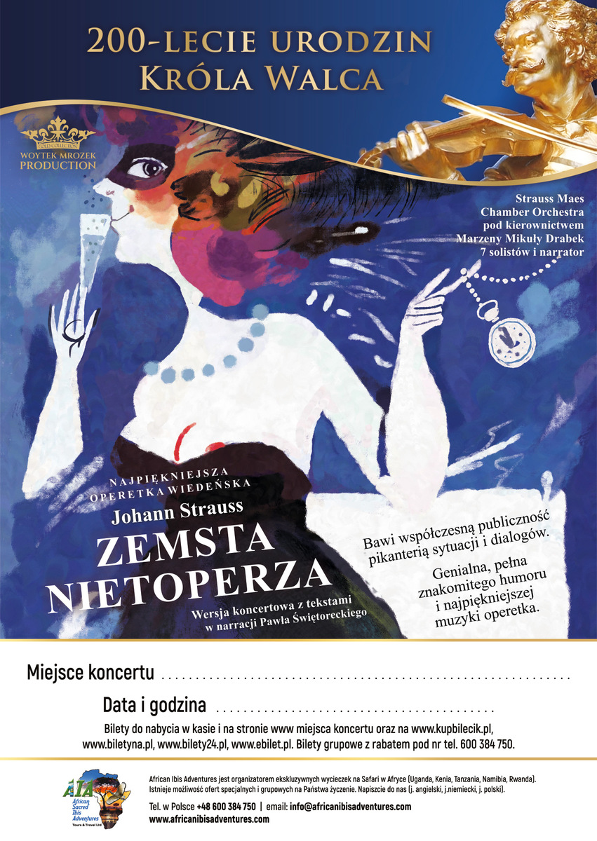 „Zemsta nietoperza” Johanna Straussa to genialna, pełna znakomitego humoru i najpiękniejszej muzyki operetka. Jej premiera odbyła się 5 kwietnia 1874 roku w Theater an der Wien w Wiedniu. Uznana została za arcydzieło operetki wiedeńskiej. Dzieło posiada jedno z najlepiej napisanych w operetkowej literaturze libretto, które tak zaintrygowało Straussa, że w rekordowym czasie sześciu tygodni skomponował do niego muzykę. Operetka, której akcja rozgrywa się pod koniec XIX w., przesycona jest tanecznym rytmem i wiedeńską radością życia. Bawi współczesną publiczność pikanterią sytuacji i dialogów. Tytułowa zemsta to przewrotna intryga doktora Falke, który mści się za kawał, jaki zrobił mu Eisenstein, porzucając go nad ranem po karnawałowej maskaradzie pijanego w przebraniu nietoperza. Całość historii wieńczy porywająca muzyka przepełniona bogactwem melodii, oddająca charakter karnawałowych zabaw i nastroju beztroski. Wszystko to tworzy niepowtarzalną atmosferę i pozwala przeżyć wspaniały wieczór wypełniony śpiewem i śmiechem. Dzieło „Króla Walca” swoją popularność zawdzięcza błyskotliwym dialogom, dowcipnym, zaskakującym sytuacjom i śmiałej erotyce. Brawurowa komedia z intrygującym librettem w doskonałym i pełnym humoru i pikanterii tłumaczeniu Juliana Tuwima jest dodatkowym atutem polskiej wersji językowej. W niezwykle barwnym i pełnym operetkowych przebojów spektaklu występują jako: Rosalinda - Jolanta Kremer, Eisenstein - Marcin Kotarba, Adela – Roksana Majchrowska, Alfred - Oskar Jasiński, Dr Falke - Ireneusz Miczka, Frank – Andrzej Witlewski, Frosch - Jerzy Gościński oraz Paweł Świętoracki narrator-konferansjer. Śpiewakom towarzyszy Woytek Mrozek Strauss Chamber Orchestra pod dyrekcją Dr Adama Wagnera.