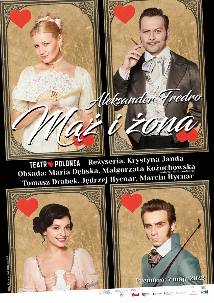 MĄŻ I ŻONA – najcudowniejsza z komedii Aleksandra Fredry. Tym razem w wiele obiecującej, wręcz wymarzonej, obsadzie. Zabawa, intryga, przyjemność i nieśmiertelny hrabia Fredro z jego kpiną, urodą ciętego języka i pięknem wiersza. Mamy nadzieję na szampańskie wieczory.