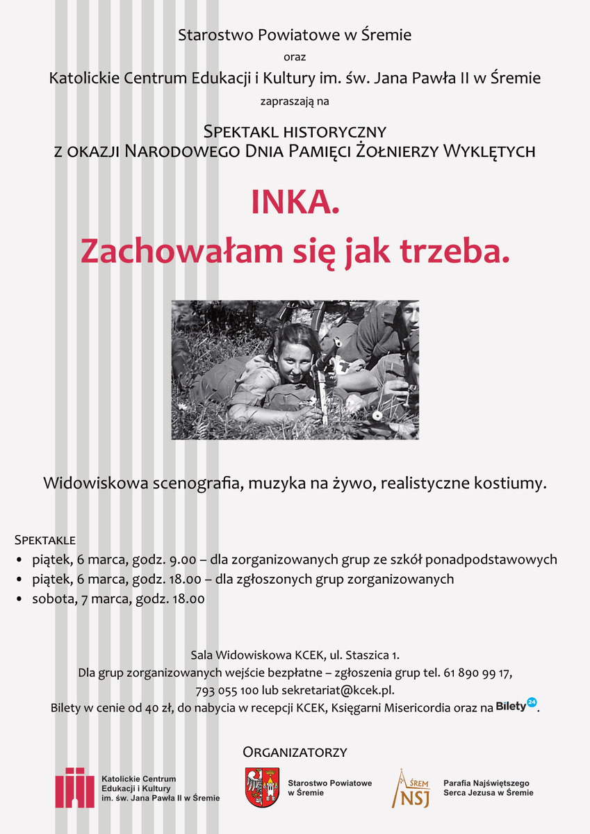 Starostwo Powiatowe w Śremie i Katolickie Centrum Edukacji i Kultury im. św. Jana Pawła II w Śremie zapraszają Państwa na spektakl historyczny z okazji Narodowego Dnia Pamięci Żołnierzy Wyklętych - "INKA. Zachowałam się jak trzeba."
