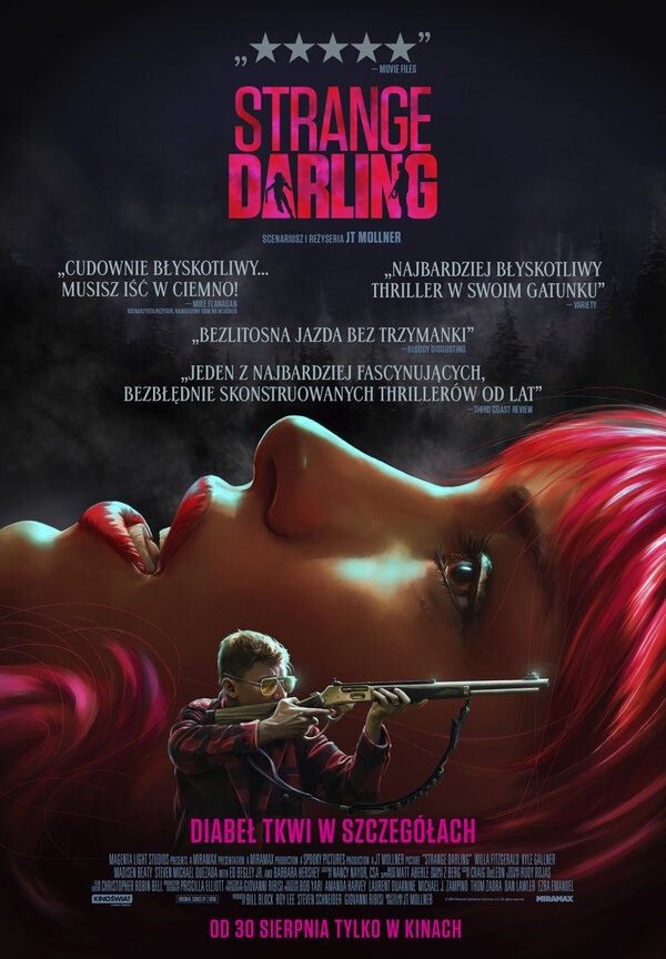 Strange Darling to amerykański thriller z 2023 roku, wyreżyserowany i napisany przez JT Mollnera. Ten intensywny film skupia się na niecodziennym spotkaniu kobiety i mężczyzny, które przeradza się w niebezpieczną grę w kotka i myszkę, pełną przemocy i zbrodni. Oparty na nieliniowej narracji, film prezentuje sześć rozdziałów, które odkrywają kulminację długoletniego ciągu morderstw seryjnego zabójcy na zachodnim wybrzeżu Stanów Zjednoczonych.