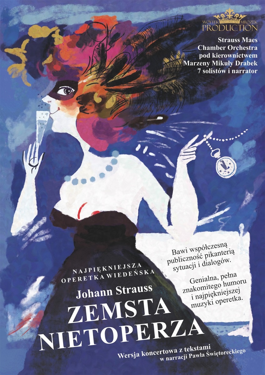 „Zemsta nietoperza” Johanna Straussa to niepodważalnie najpiękniejsza, genialna, pełna znakomitego humoru, dowcipu, aktualnego żartu i najpiękniejszej muzyki wiedeńska operetka. Jej premiera odbyła się 5 kwietnia 1874 roku w Theater an der Wien w Wiedniu. Uznana została za arcydzieło operetki wiedeńskiej. Dzieło posiada jedno z najlepiej napisanych w operetkowej literaturze libretto, które tak zaintrygowało Straussa, że w rekordowym czasie sześciu tygodni skomponował do niego muzykę. Operetka, której akcja rozgrywa się pod koniec XIX w., przesycona jest tanecznym rytmem i wiedeńską radością życia. Bawi współczesną publiczność pikanterią sytuacji i dialogów. Tytułowa zemsta to przewrotna intryga doktora Falke, który mści się za kawał, jaki zrobił mu Eisenstein, porzucając go nad ranem po karnawałowej maskaradzie pijanego w przebraniu nietoperza. Całość historii wieńczy porywająca muzyka przepełniona bogactwem melodii, oddająca charakter karnawałowych zabaw i nastroju beztroski. Wszystko to tworzy niepowtarzalną atmosferę i pozwala przeżyć wspaniały wieczór wypełniony śpiewem, szampanem i śmiechem. Dzieło „Króla Walca” swoją popularność zawdzięcza błyskotliwym dialogom, dowcipom, zaskakującym sytuacjom i śmiałej erotyce. Brawurowa komedia z intrygującym librettem w doskonałym i pełnym humoru i pikanterii tłumaczeniu Juliana Tuwima jest dodatkowym atutem polskiej wersji językowej.
