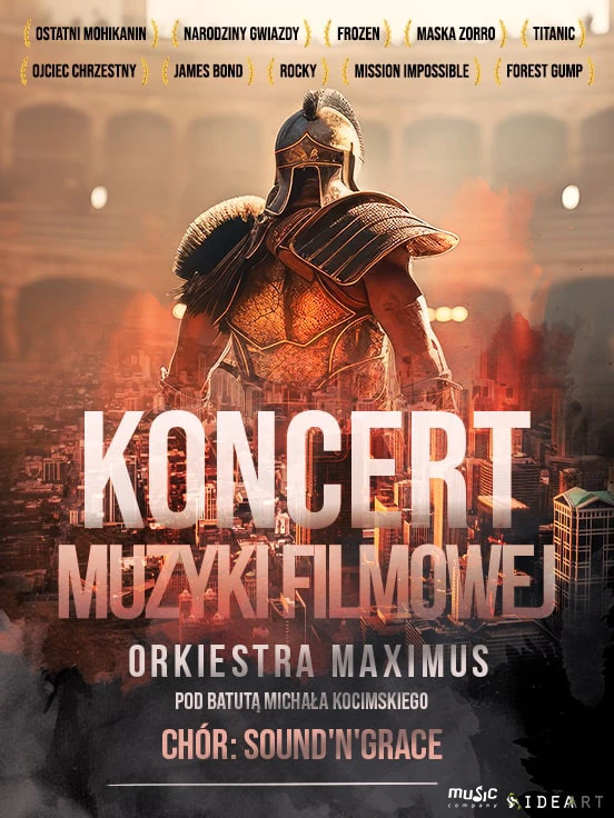 Koncert Muzyki Filmowej - to wyjątkowe wydarzenie muzyczne, które przenosi nas w świat filmowych bohaterów i ich niezwykłych historii. Orkiestra MAXIMUS pod kierownictwem cenionego dyrygenta Michała Kocimskiego wraz z Chórem Sound’n’Grace, łączy na scenie nieprzeciętnych artystów i przeprowadza nas przez dzieje kina, prezentując słynne tematy muzyczne. W repertuarze znajdują się hity ze znanych dramatów, komedii, filmów akcji czy romansów. Podczas koncertu pojawią się utwory z filmów takich, jak „Rocky”, „Titanic”, „Ojciec chrzestny”, „Shallow”, czy „Ostatni Mohikanin”.