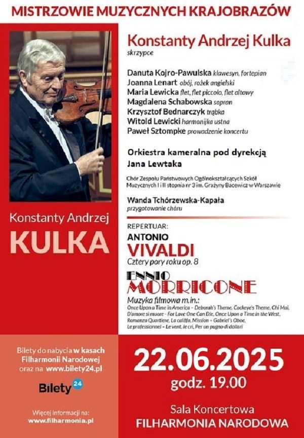W pierwszej części koncertu usłyszymy najbardziej znaną i lubianą kompozycję Antonio Vivaldiego - Cztery pory roku op. 8 w mistrzowskim wykonaniu Konstantego Andrzeja Kulki, który 25 listopada 1959 roku, jako 12-letni wirtuoz zagrał swój pierwszy solowy recital skrzypcowy w Gdańsku Wrzeszczu. Towarzyszyć mu będzie orkiestra kameralna pod dyrekcją Jana Lewtaka, na klawesynie zagra Danuta Kojro-Pawulska.